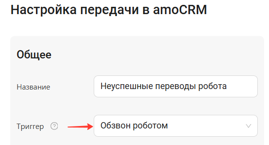 В карточке профиля интеграции найдите блок «Общее» и выберите триггер: «Обзвон роботом».