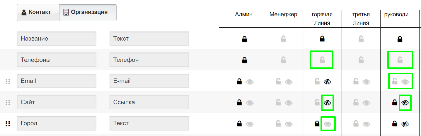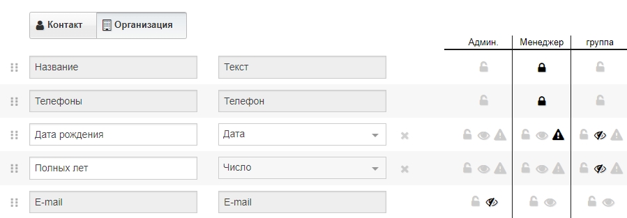 2. Поля ФИО, название организации и телефон можно делать нередактируемыми, нажав на иконку с замком. Скрывать их нельзя. Это основные поля, необходимые для работы. При этом для скрытия поля «Телефон» можно воспользоваться функцией «Скрытие телефонных номеров».