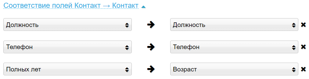 Пользовательские поля доступны для выбора в настройках соответствия полей «Организация → Компания», «Организация → Лид» и «Контакт → Контакт», «Контакт → Лид».