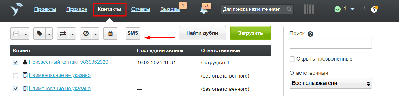 Если вы хотите отправить SMS сразу нескольким клиентам, то нужно зайти во вкладку «Контакты», поставить чекбоксы рядом с интересующими клиентами, а затем кликнуть на кнопку «SMS».
