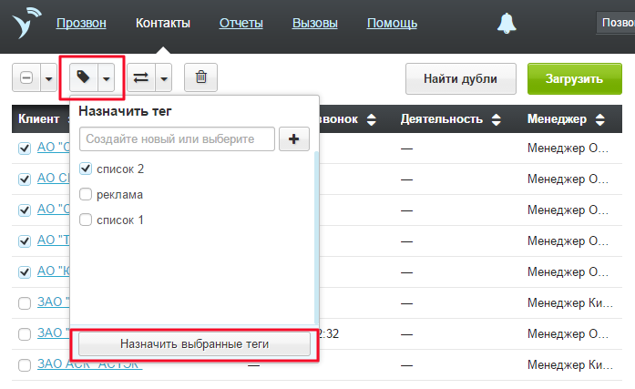Тег — это метка контакта. Назначайте теги контактам, чтобы быстро находить нужную базу или контакт.