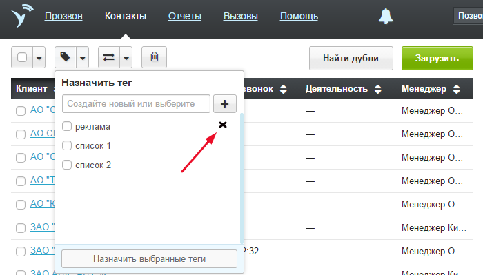 Чтобы удалить теги, нажмите на значок тега в верхнем меню раздела. Выберите тег и нажмите на крестик справа от названия. Тег удаляется только у контактов пользователя, который его удаляет. У других пользователей тег остается доступным.