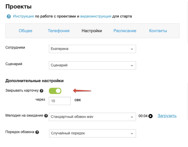 Закрытие карточки по таймеру полезно, если нужно ограничить время менеджера на заполнение карточки. Время начинает отсчитываться после завершения разговора с клиентом. По завершению, карточка закроется автоматически и сотруднику поступит следующий вызов.