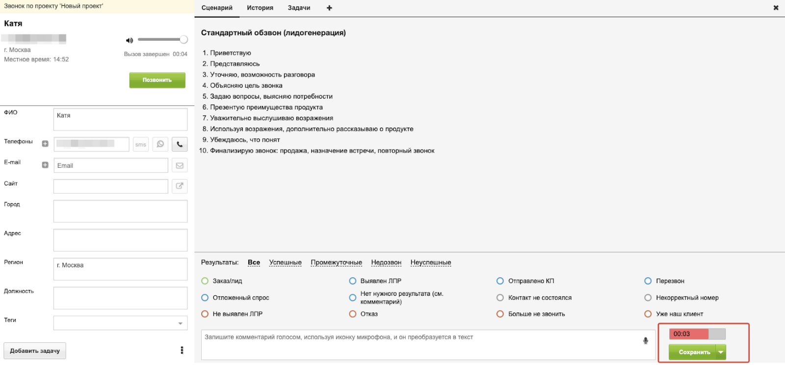 - менеджер не выбрал результат звонка – установится результат «Без результата».