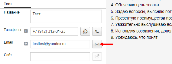 Из этой же карточки можно отправить письмо. Нажмите на значок письма напротив e-mail адреса, и откроется тело письма, которое можно отредактировать и отправить. Предварительно подключите почтовый сервер по инструкции.