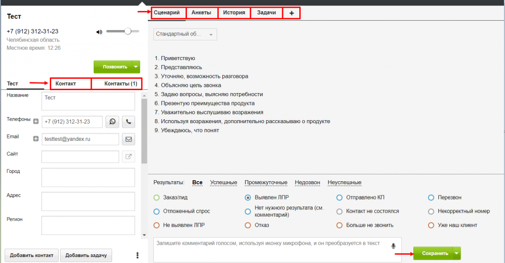 Для сохранения внесенных данных в карточку контакта по окончанию звонка нажмите на «Сохранить», после чего сервис автоматически откроет следующий контакт по списку.