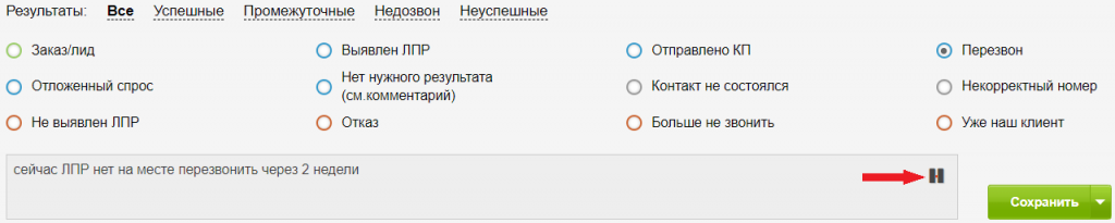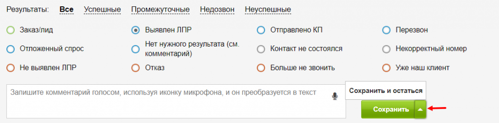 Чтобы сохранить результат звонка без закрытия карточки и перехода к следующей, нажмите на стрелку и выберите «Сохранить и остаться». Такой вариант подойдет для случая, когда вы совершили звонок в организацию и получили контакт ЛПР, которому планируете позвонить в рамках этой же карточки.