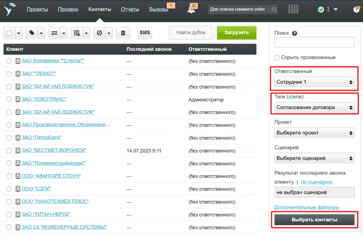 По умолчанию в разделе «Контакты» администратор видит только свои теги. Для того, чтобы увидеть или отфильтровать контакты по тегам менеджера, необходимо выбрать сначала нужного менеджера в фильтре, а затем название тега и нажать кнопку «Выбрать контакты». Контакты по тегу менеджера будут отфильтрованы.