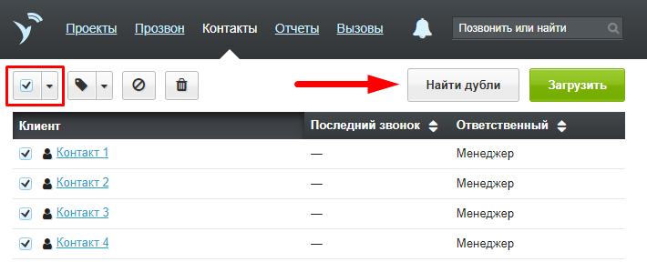 Воспользуйтесь поиском дублей в сервисе, чтобы исключить повторные звонки одному клиенту или навести порядок в базе контактов. В зависимости от задач, дубли контактов можно удалить или объединить в один.