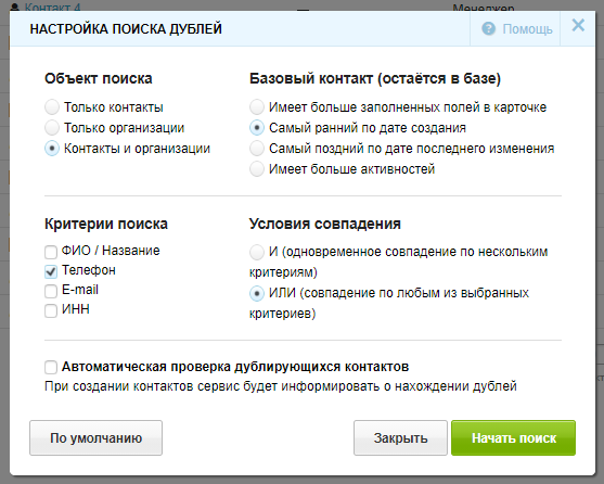 Важно: дубли не ищутся среди контактов в одной организации и среди контактов в разных организациях.