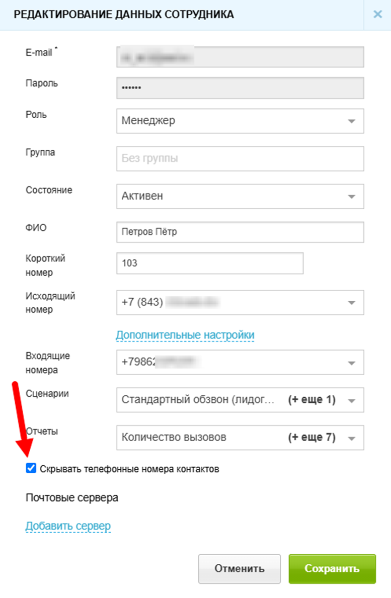 Скрытие номеров — это опция, которая позволяет скрывать номера контактов от сотрудников. При включенной опции сотрудники будут видеть кнопку «Позвонить» по всем клиентам в системе. Кроме того, сотрудники не смогут использовать номера контактов в личных целях.