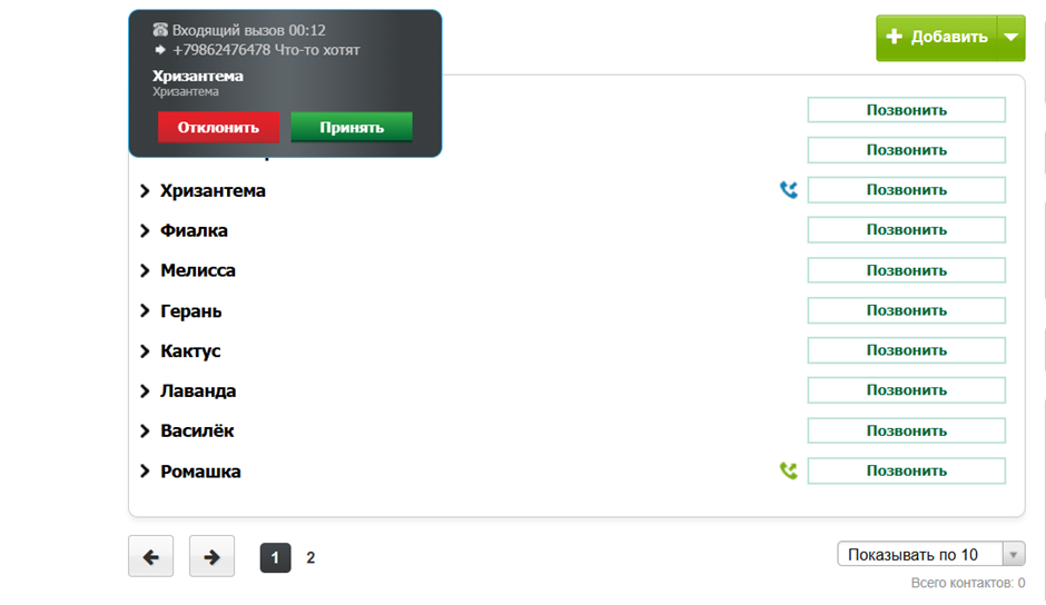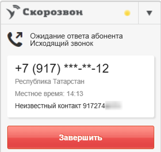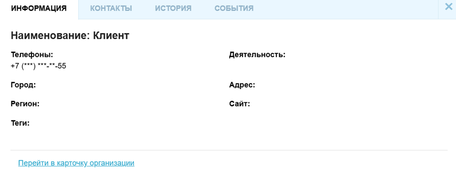 При входящем вызове от уже существующего контакта сотруднику будет отображаться название компании и номер, на который поступил входящий вызов.