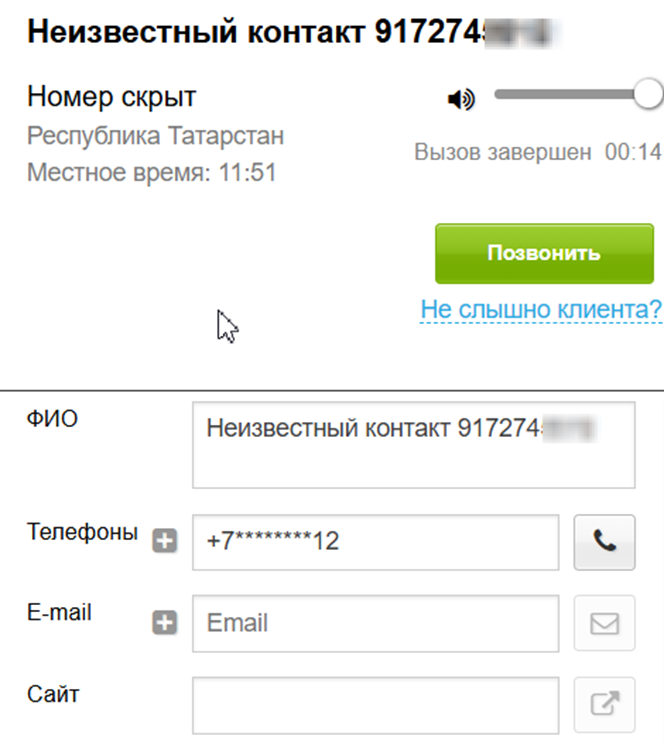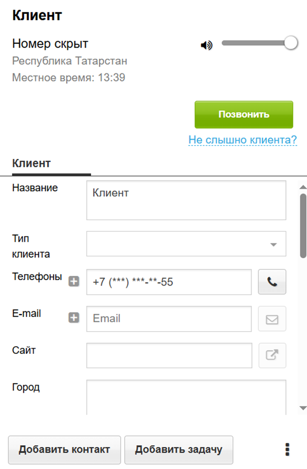 - Взаимодействие с клиентами — поле с номером телефона отсутствует для пользователя, у которого активно скрытие номеров.