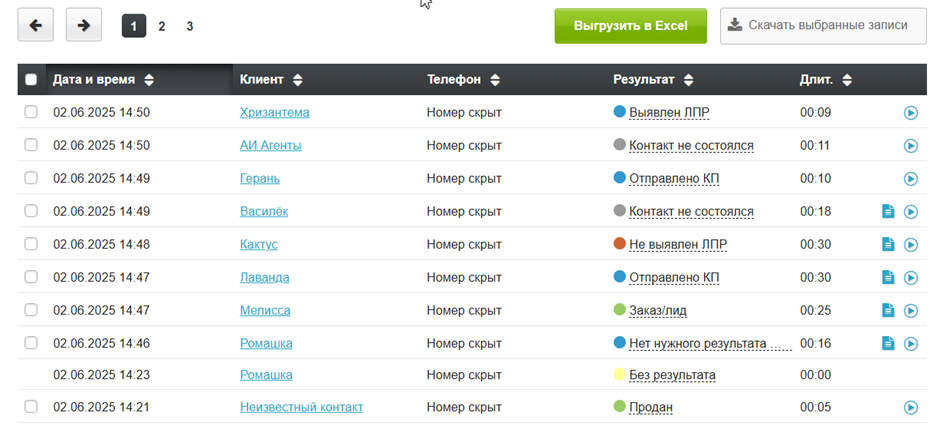 - Результаты всех вызовов — на вкладке «Отчёты» у отчёта «Результаты всех вызовов» в столбце телефон будет отображаться не номер телефона, а «Номер скрыт». При выгрузке в Excel при активном скрытии номеров поля для выгрузки «Телефон контакта» будут недоступны для выбора. Подробнее с функционалом дополнительных полей можно ознакомиться в статье.