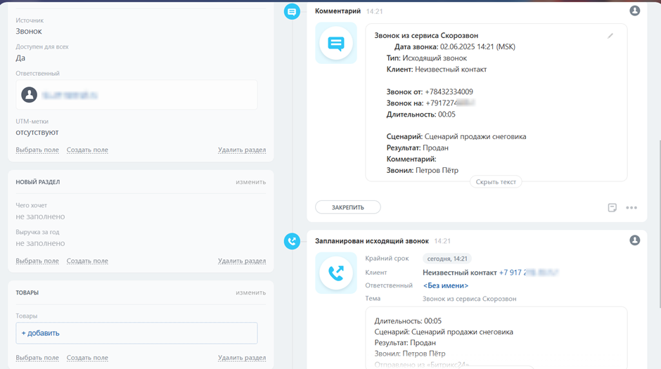 Если в Битрикс24 не настроено скрытие номеров, то в активности будет отображаться информация о номере телефона контакта.