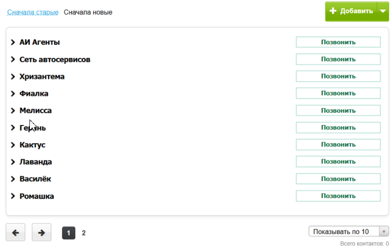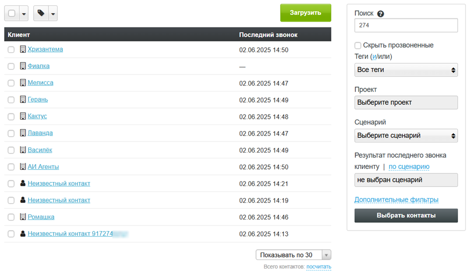 - в списке контактов в разделах «Прозвон», «Контакты», «Вызовы»;