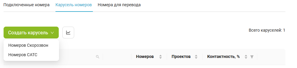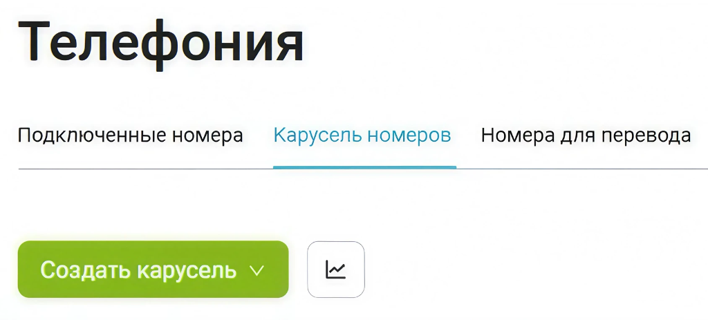 Чтобы создать карусель номеров, перейдите в раздел настроек «Телефония» и на вкладке «Карусель номеров» нажмите на кнопку «Создать карусель».