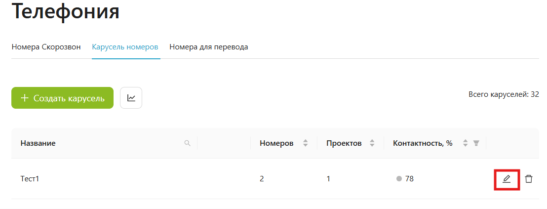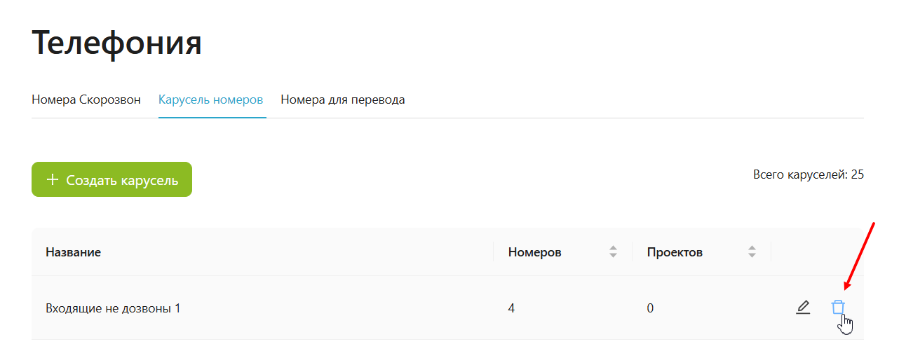Чтобы удалить карусель нажмите на корзину. После удаления карусели, номера сохранятся на аккаунте, но карусель удалится с проекта(-ов), и они перестанут звонить.