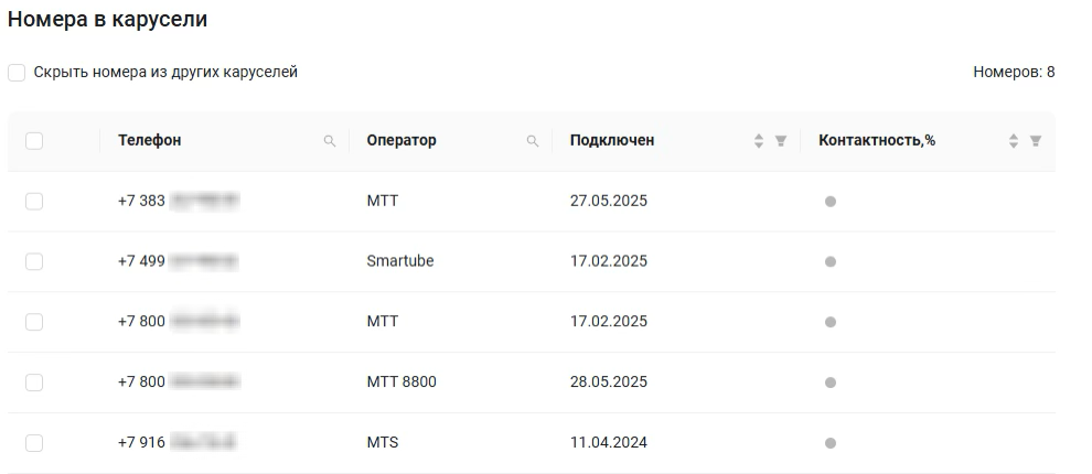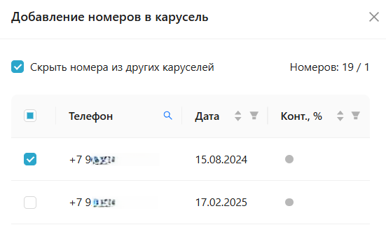 - Фильтр — активируйте чекбокс «Скрыть номера из других каруселей», чтобы оставить в таблице только номера, не используемые в других каруселях.