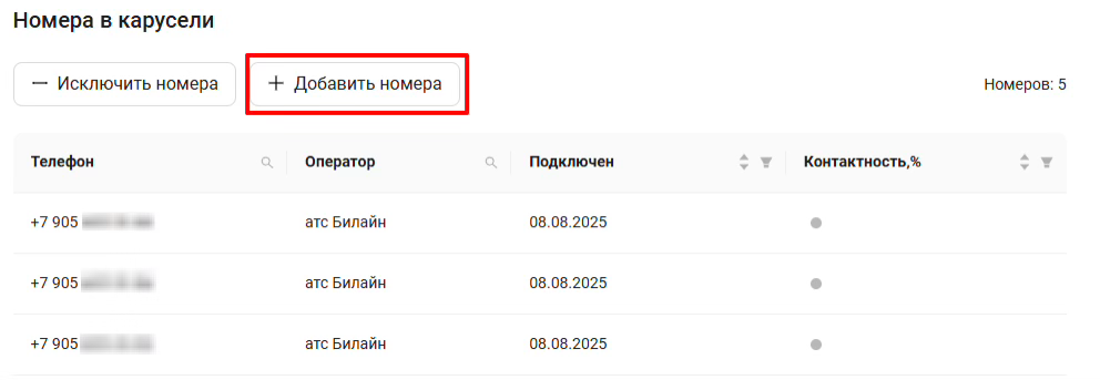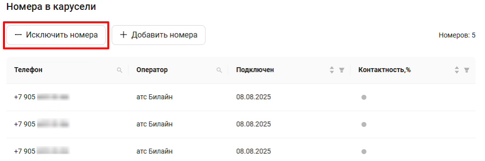 Исключение номеров из карусели доступно по кнопке «Исключить номера».