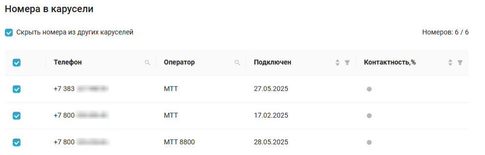 Для создания карусели необходимо добавить номера. На форме создания отображается таблица со всеми номерами на аккаунте. Выберите номера, которые будут добавлены в карусель, активировав соответствующие чекбоксы.
