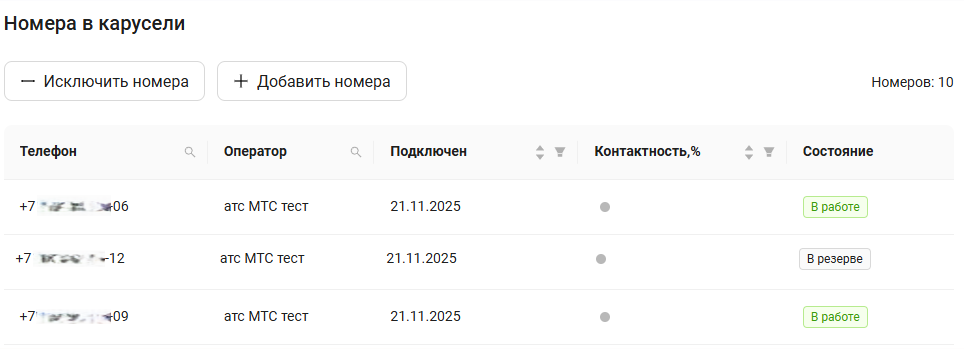 При редактировании карусели с автозаменой в таблице номеров карусели видно, какие номера «в работе» сейчас — активный пул, а какие номера ожидают своей очереди — резерв.