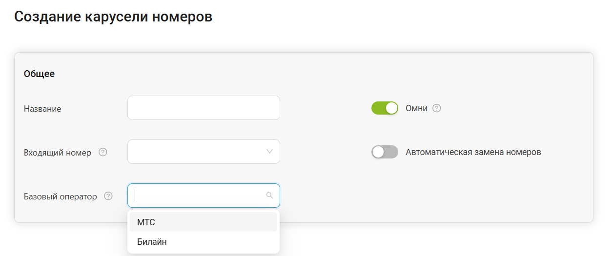 Функция «Омни» подключается для каждой карусели в отдельности при создании/редактировании карусели. Омни-карусель может использовать номера собственных АТС.
