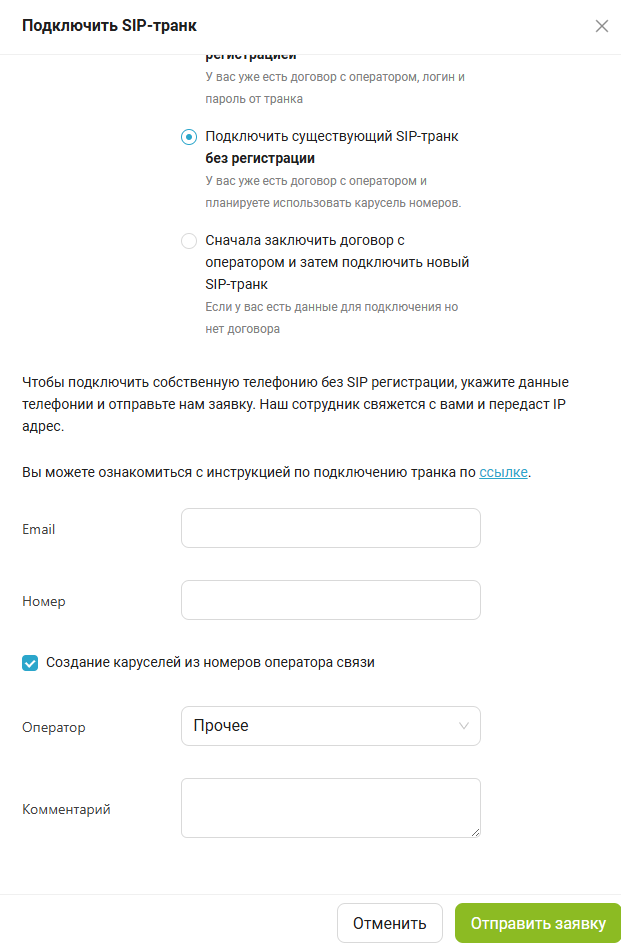 - Выберите пункт «Подключить существующий SIP-транк без регистрации».
