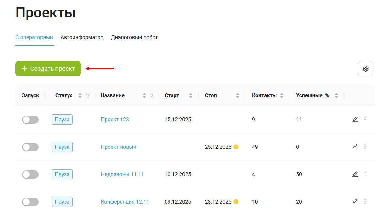 После заполнения всех настроек новый проект создается в статусе Пауза, для того чтобы начать обзвон, передвиньте переключатель запуска в активное состояние.