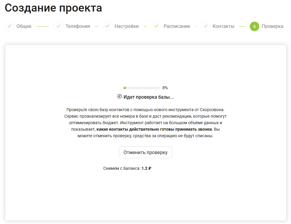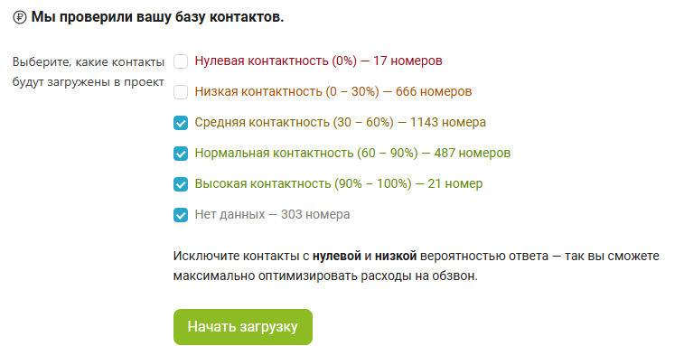 Проверка баз позволяет получить информацию о контактности номеров и рекомендации, какие контакты стоит исключить из обзвона. Скоринг проводится на основе данных сервиса «Скорозвон».