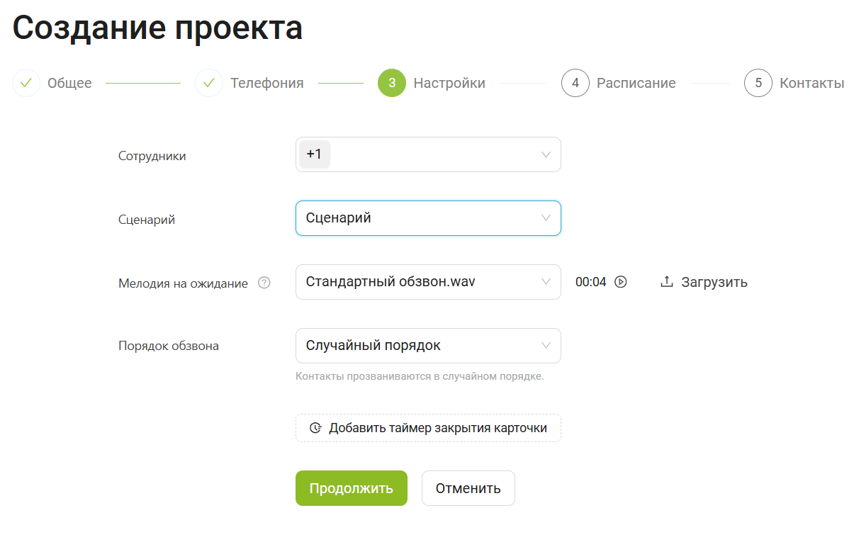 - Сценарий. Выберите сценарий, по которому будет происходить обзвон клиентов в данном проекте. При распределении звонка, менеджеру откроется карточка клиента с этим сценарием и результатами завершения разговора.