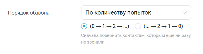- по количеству попыток — если важно сначала прозвонить контакты, которым еще не звонили. И только потом тех, кому звонили 1-2-3 раза.