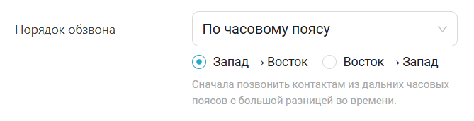 - Порядок обзвона — позволяет установить, каким контактам проект будет звонить в первую очередь. Какой порядок обзвона можно выбрать: