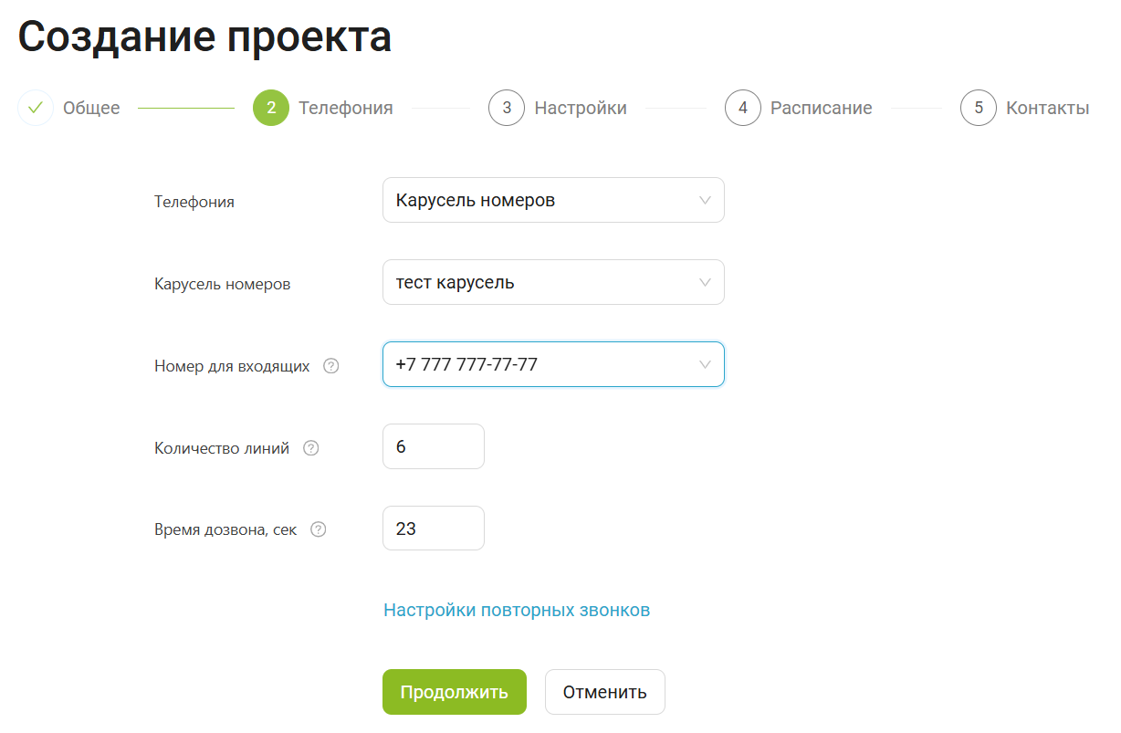 Укажите номер телефона — с него будет совершаться обзвон и он будет отображаться клиентам в рамках обзвона по текущему проекту.