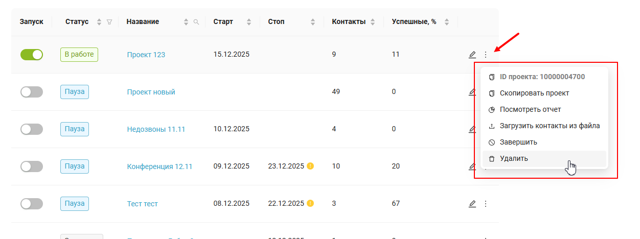 После завершения проекта, его нельзя возобновить, нужно создавать новый проект. - Удалить — удаляйте проект, когда точно знаете что он больше не требуется.