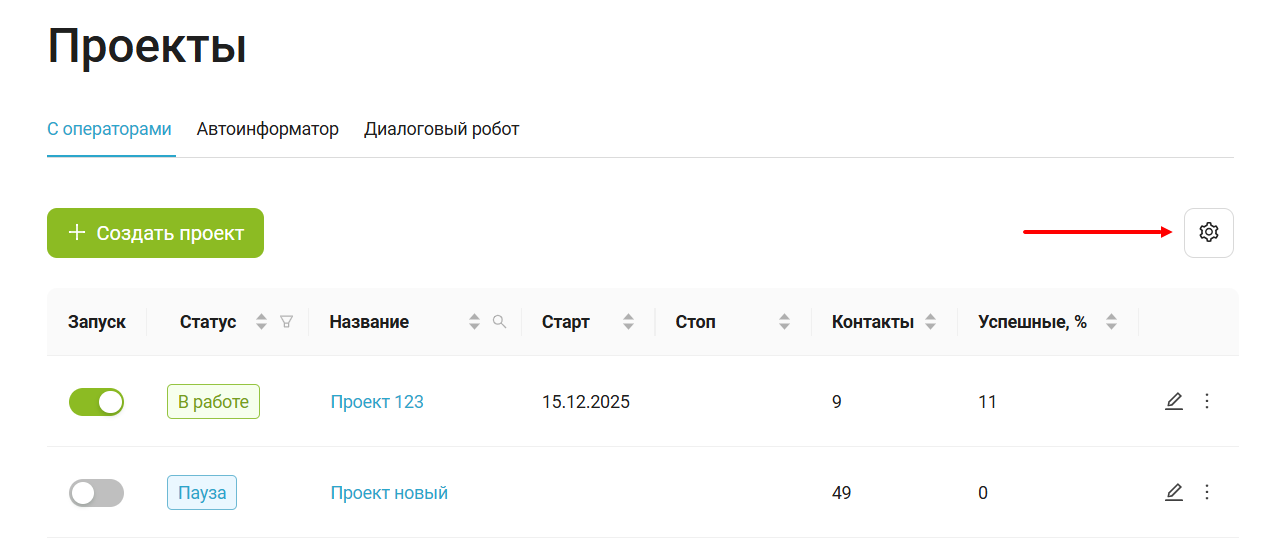 Настройка находится в разделе Проекты → С операторами, шестеренка справа над списком проектов.