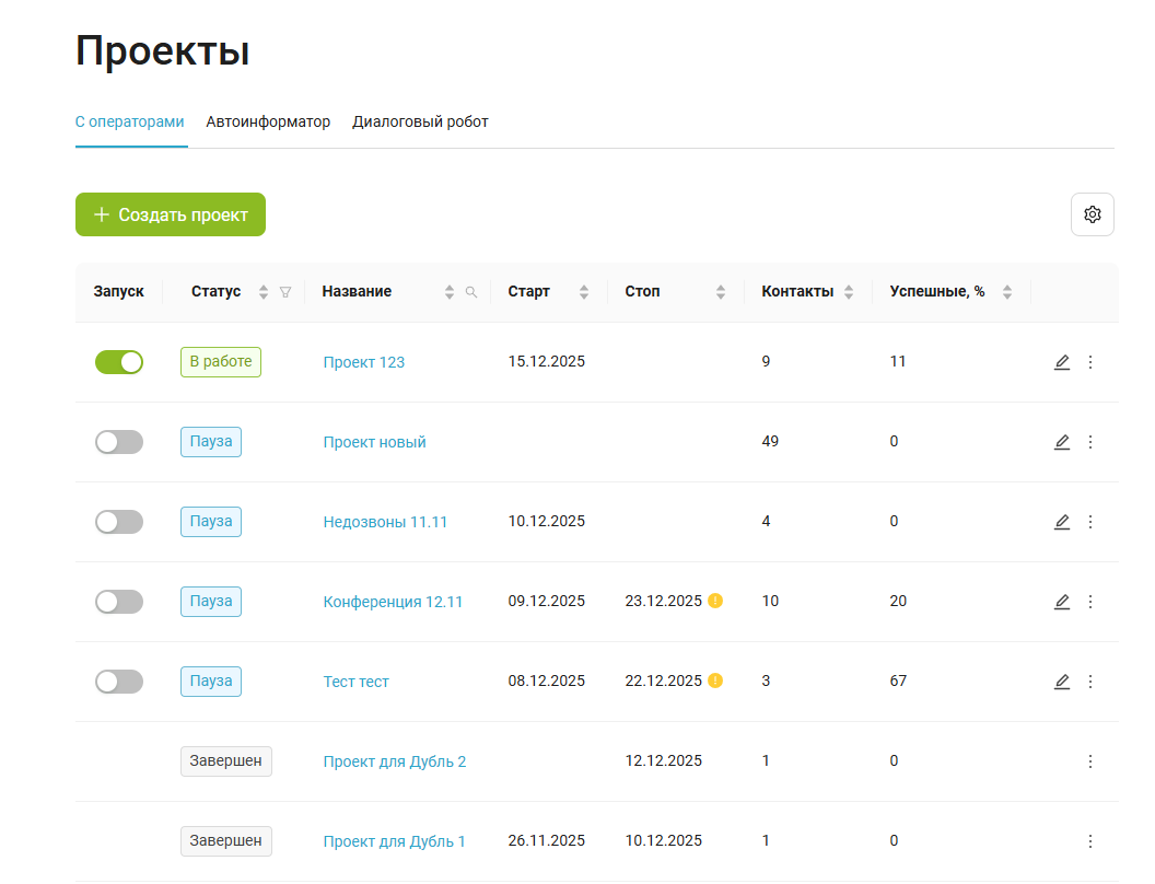 - Проекты с операторами — это проекты исходящего обзвона, где звонки обрабатываются операторами.