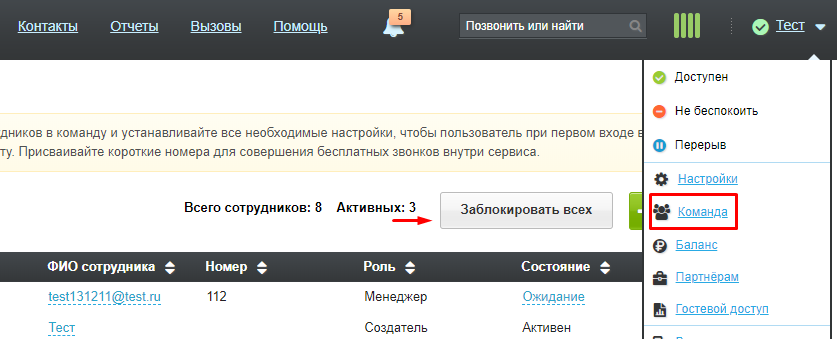 - Блокировка доступна во вкладке «Команда» («Имя пользователя» — «Команда»). На заблокированные учётные записи невозможно войти, также за них не списывается абонентская плата.