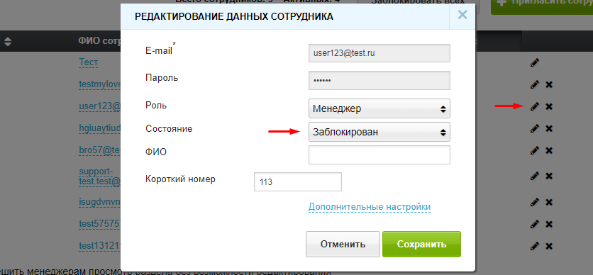 - Для блокировки отдельного пользователя нужно нажать на иконку с изображением карандаша напротив пользователя, которого требуется заблокировать, далее выбрать состояние «Заблокирован» и сохранить настройку. Для разблокировки пользователя нужно выбрать состояние «Активен» и сохранить настройку.