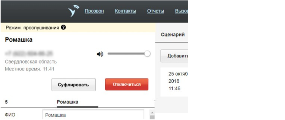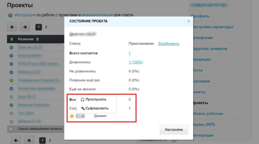 Кликаем на «Проекты» в главном меню → жмём на название проекта → во всплывающем окне «Состояние проекта» нажимаем на время в звонке →выбираем «Суфлировать» или «Прослушать».