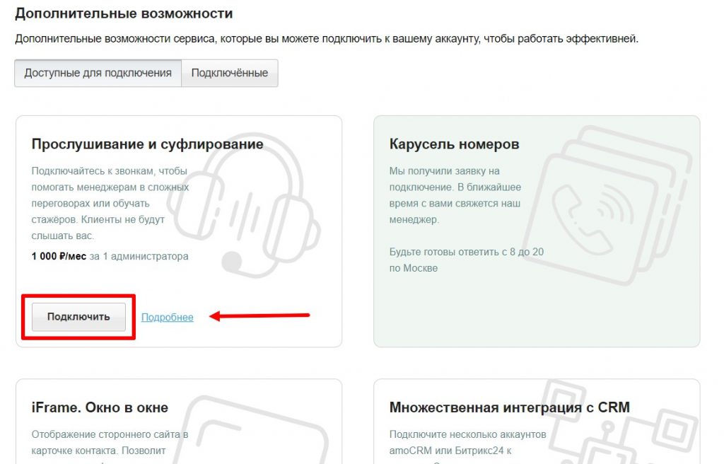 Перейдите в раздел с дополнительными возможностями «Баланс» → «Тариф и возможности». Нажмите «Подключить» и отправьте заявку на подключение суфлирования и прослушивания.