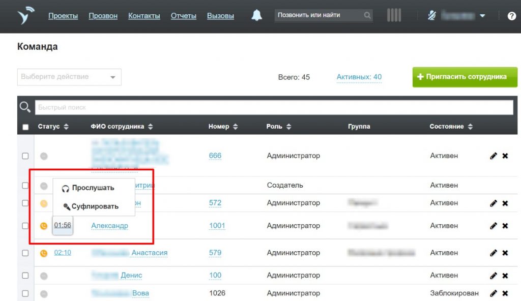 Кликаем «Имя аккаунта» в правом верхнем углу → во всплывающем меню выбираем строку «Команда» → кликаем на время нахождения сотрудника в статусе разговора → выбираем опцию «Прослушать» или «Суфлировать» во всплывающем окне.