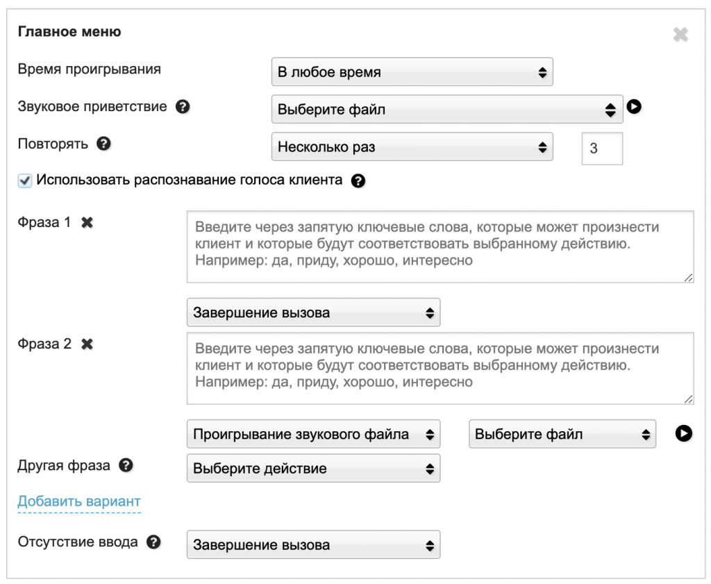 Если активировать чекбокс «Использовать распознавание голоса клиента», то клиенту не придется нажимать на кнопки во время разговора, достаточно будет проговорить ответ и сервис сам определит соответствующее действие.