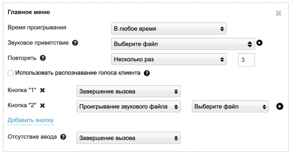 На странице настроек откроется форма создания первого голосового меню. По умолчанию оно является главным. Создавать можно несколько вариантов голосового меню и выбирать нужный для проигрывания.