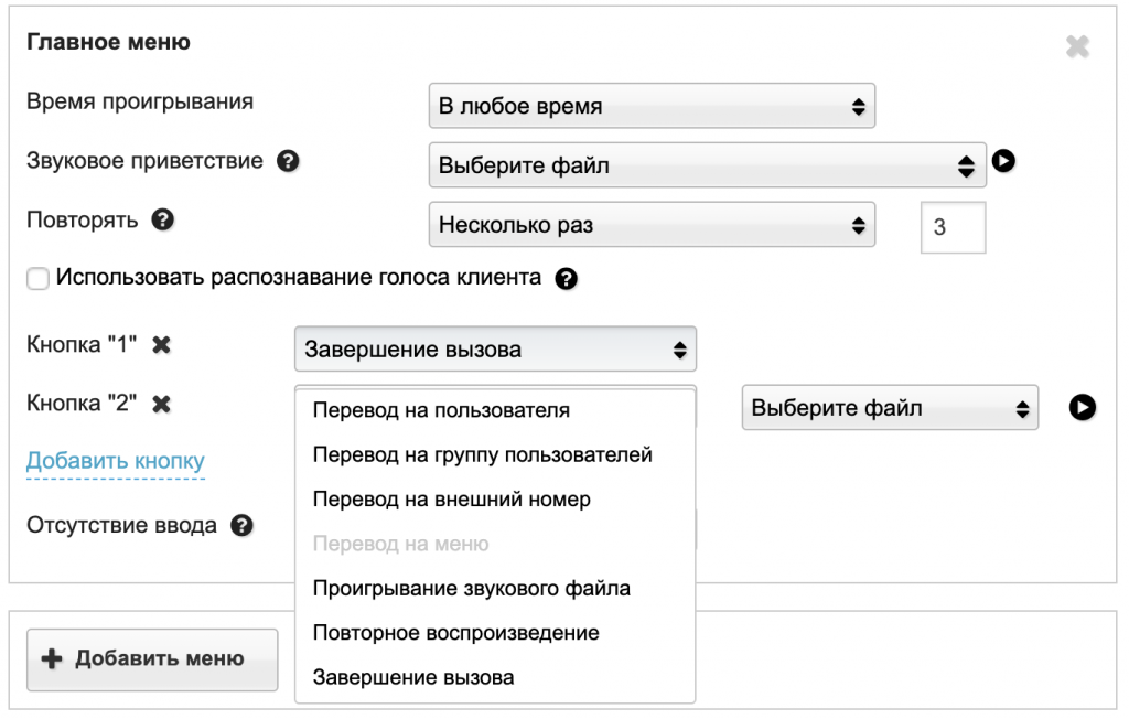 Голосовое меню — это звуковой файл, проигрываемый при звонке клиента, с возможностью выбора клиентом определенного действия: перевод звонка в нужный отдел компании, перевод на конкретного сотрудника, проигрывание информации и так далее.