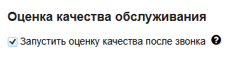 Для подключения необходимо перейти в Скорозвон → Настройки → Входящие → [Линия] → Общие настройки → Оценка качества обслуживания. Активируйте чекбокс «Запустить оценку качества после звонка». В этом случае после входящего звонка клиенту будет предложено оценить разговор по шкале 1–5.